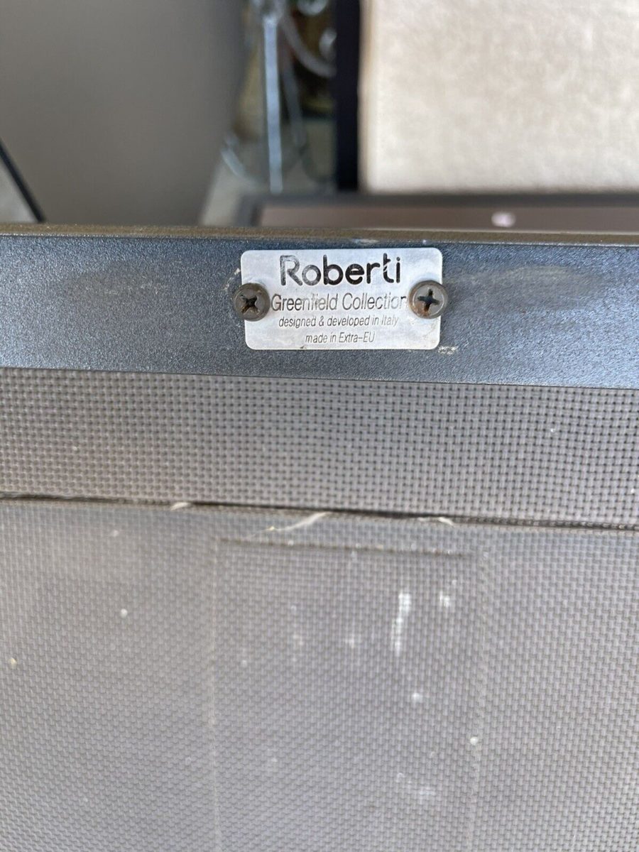 This high end, modern Italian 6 piece aluminum Coral Reef patio set from the Roberti Greenfield Collection includes a loveseat, a lounge, 2 chairs, an ottoman, and a coffee table. We have the cushions for the set, although they are not shown in the pictures. The cushions contain 6.5″ high density foam, but the outer fabric was a little bit sun worn (we are in Arizona), so we have new ordered covers. Please contact us for details.